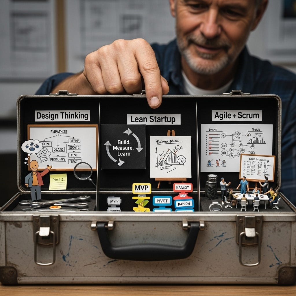 We’re going to look at three methodologies that successful organisations, from nimble start-ups to the big corporates, use to navigate the path from vague concept to validated, market-ready product. Think of this as your integrated, high-powered toolkit. I’ve worked across quite a few different industries, and led a wide range of Innovation Projects , and I’ve seen many companies that do some of these well, but it’s the ones that bring them all together that really fly. One thing I should say: I’ve given you specific frameworks here, but not all of the elite innovators I’ve worked with deploy all of these. But they do all deploy the three approaches in one form or another. However, this is a 101, so I’m assuming that you’re new to this, and these frameworks give you a great starting point.